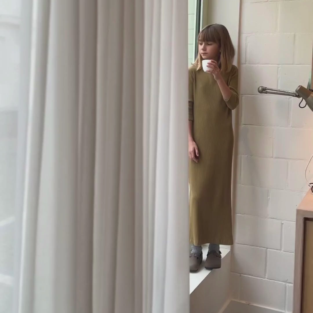 Robe longue côtelée à manches 3/4 Orchidée. 100% coton issu de l'agriculture biologique. Made in Portugal.