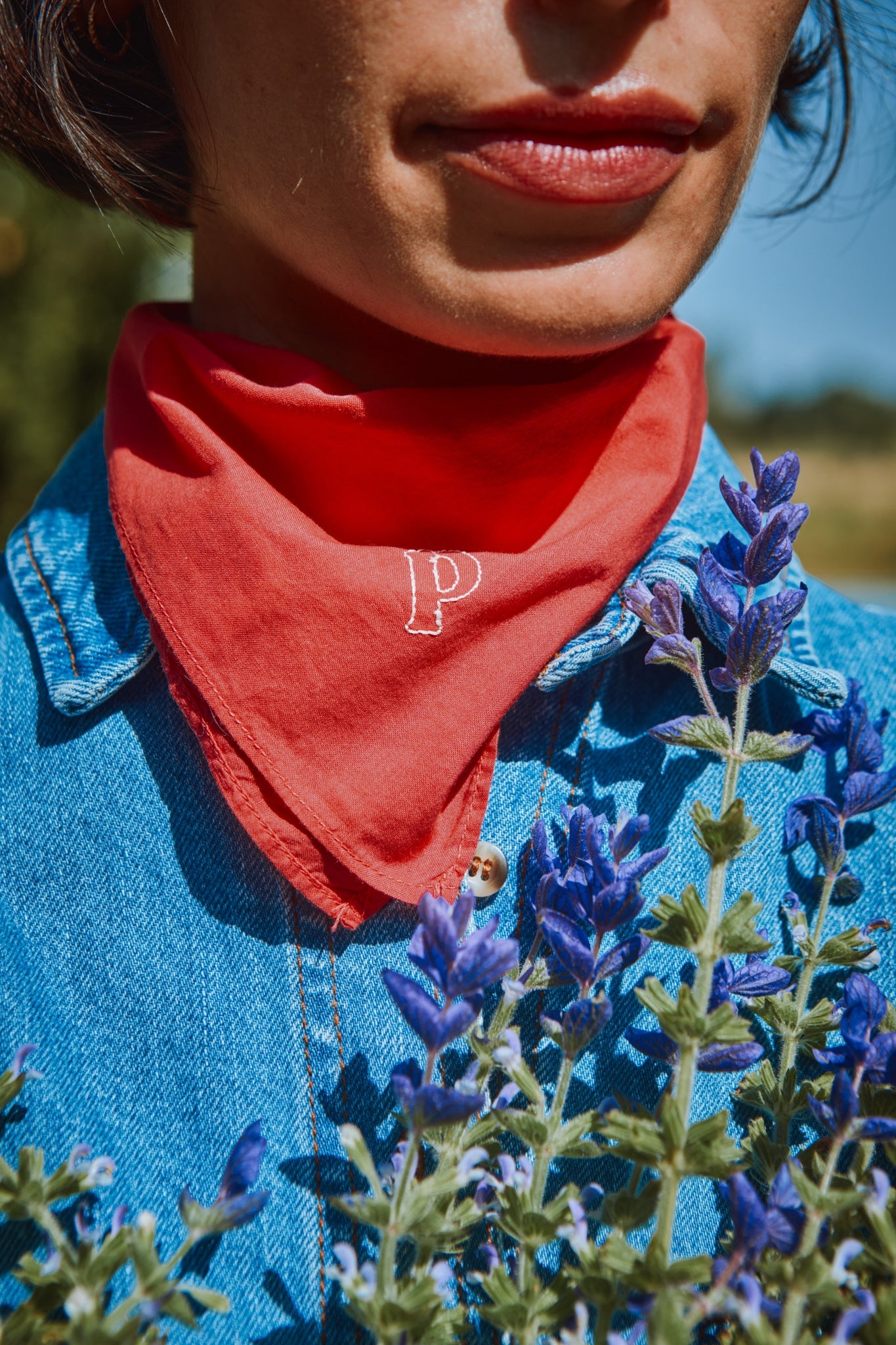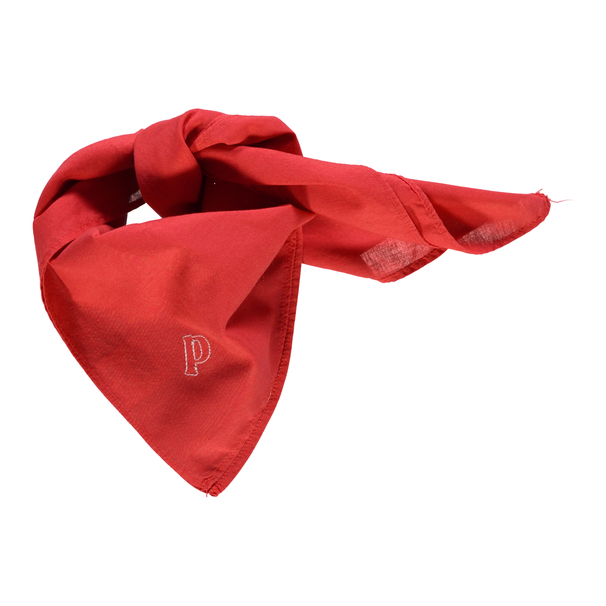 Foulard brodé avec le "P" de poudreorganic. 100% coton issu de l'agriculture biologique. Made in Portugal. Mixte. Peut-être utilisé en foulard, bandeau à cheveux... L'allié du quotidien. Dimensions : 55 x 55 cm.